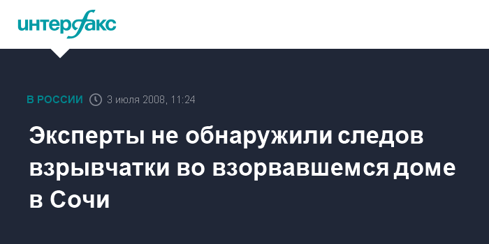 Москва. 3 июля. INTERFAX.RU – Сегодня стали известны первые данные взрывотехнической экспертизы, проведенной на основе материалов, изъятых на обследованных экспертами участках 12-этажного дома близ Сочи (Краснодарский край), в котором утром в среду прогремел мощный взрыв.