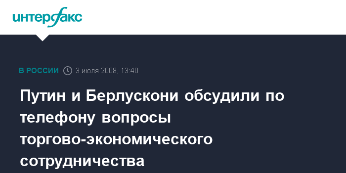 Москва. 3 июля. INTERFAX.RU – Председатель правительства РФ Владимир Путин в четверг провел телефонный разговор с премьером Италии Сильвио Берлускони.