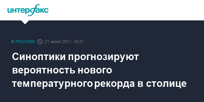 Москва. 21 июля. INTERFAX.RU – Температура воздуха в Москве в последние дни отклонялась от среднесуточной нормы на 4-6 градусов, в выходные отклонение составит 6-9 градусов, а в среду на следующей неделе высока вероятность установления нового температурного рекорда, прогнозируют синоптики.