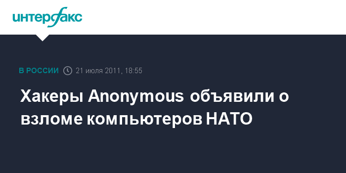 Вашингтон. 21 июля. INTERFAX.RU - Известная группа хакеров, действующая под псевдонимом Anonymous, утверждает, что им удалось взломать систему защиты компьютеров НАТО и получить доступ к огромному количеству секретных данных, сообщает в четверг американский телеканал "Фокс-ньюс".