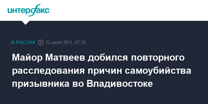 Владивосток. 22 июля. ИНТЕРФАКС - ДАЛЬНИЙ ВОСТОК - Военный прокурор Уссурийского гарнизона по заявлению майора внутренних войск МВД РФ Игоря Матвеева потребовал провести повторную доследственную проверку по факту гибели в части во Владивостоке в 2009 году рядового Дмитрия Косенко.