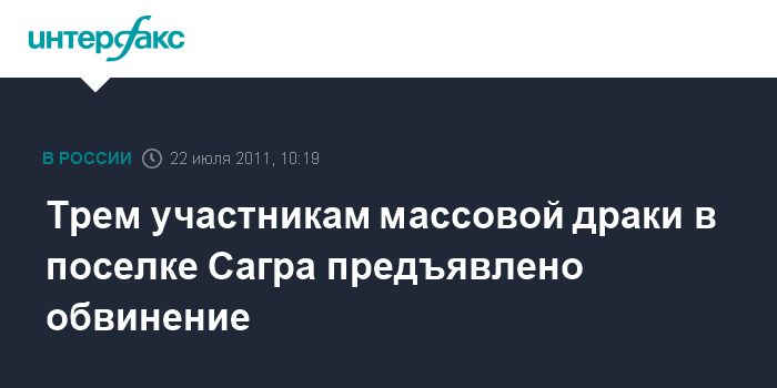 Москва. 22 июля. INTERFAX.RU - Трем активным участникам массовой драки в поселке Сагра (Свердловская область) предъявлено обвинение в хулиганстве, совершенном группой лиц с применением оружия, сообщил "Интерфаксу" официальный представитель СК РФ Владимир Маркин.