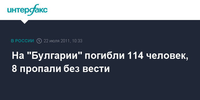 Москва. 22 июля. INTERFAX.RU - По данным СК РФ, в результате крушения "Булгарии" погибло 114 человек, еще восемь числятся пропавшими без вести, сообщил "Интерфаксу" официальный представитель СК РФ Владимир Маркин.