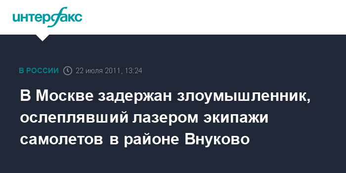 Москва. 22 июля. INTERFAX.RU - Спецслужбы задержали в Москве подозреваемого в ослеплении лазерными лучами самолетов в районе аэропорта "Внуково".