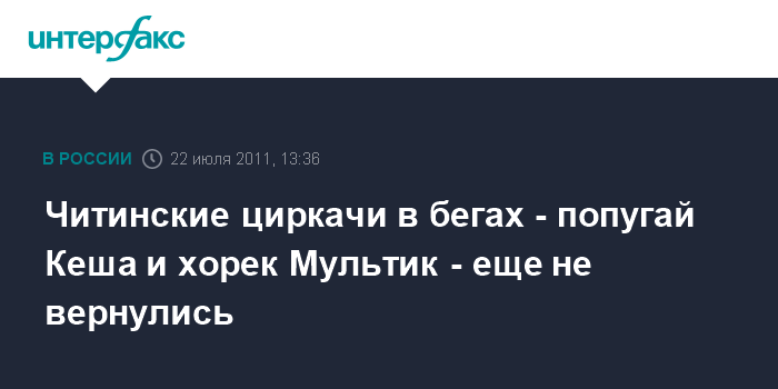 Чита. 22 июля. INTERFAX.RU - Сотрудники читинского цирка "Шапито" не теряют надежды найти попугая Кешу и хорька Мультика, сбежавших от депрессии, вызванной затяжными дождями.