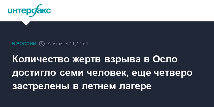 Осло. 22 июля. INTERFAX.RU - Жертвами взрыва в правительственном квартале Осло в пятницу стали семь человек, сообщили представители столичной полиции.