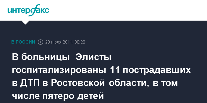 Элиста. 23 июля. ИНТЕРФАКС-ЮГ - В детскую республиканскую больницу в Элисте (Калмыкия) госпитализированы пятеро детей, пострадавших в ДТП в Ростовской области.