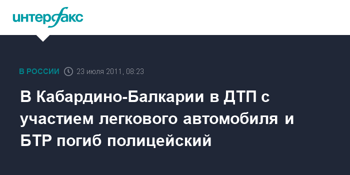 Ростов-на-Дону. 23 июля. ИНТЕРФАКС-ЮГ - Полицейский стал жертвой ДТП с участием БТР и "ВАЗ-2112", сообщили агентству "Интерфакс - Юг" в правоохранительных органах Кабардино-Балкарии.