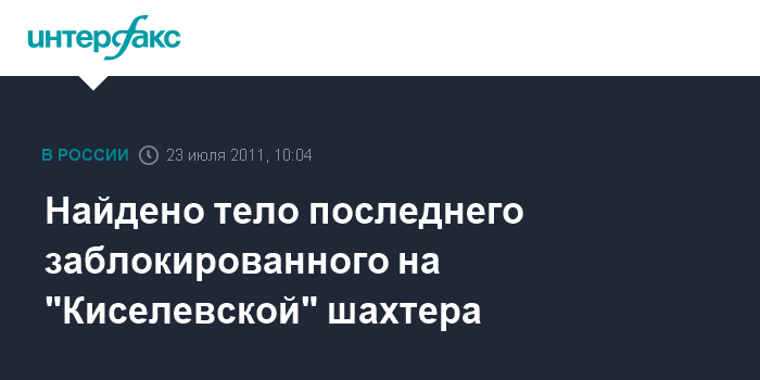 Кемерово. 23 июля. INTERFAX.RU - Тело четвертого горняка, погибшего в результате аварии более месяца назад на шахте "Киселевская" в Кемеровской области, обнаружено спасателями, сообщила в субботу агентству "Интерфакс-Сибирь" официальный представитель СУ СКР по региону Надежда Ананьева. По ее данным, в настоящее время проводятся работы по поднятию тела на поверхность.