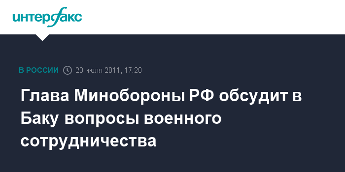 Баку. 23 июля. INTERFAX.RU - Министр обороны России Анатолий Сердюков совершит 25-26 июля рабочий визит в Азербайджан, сообщил в субботу агентству "Интерфакс-Азербайджан" источник в оборонных кругах республики.