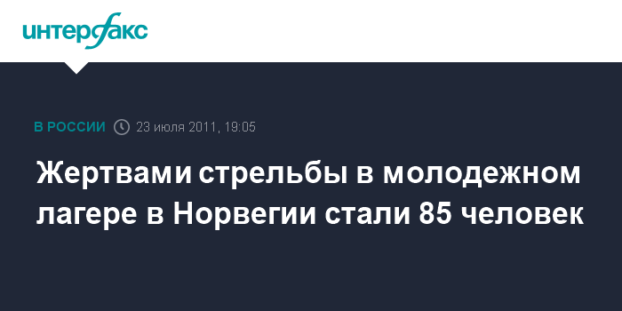 Лондон. 23 июля. INTERFAX.RU - В результате стрельбы в молодежном лагере на острове Утойа недалеко от Осло, по уточненным данным, погибли 85 человек, сообщает британская телерадиокорпорация Би-Би-Си. Ранее полиция сообщала о 84 погибших.