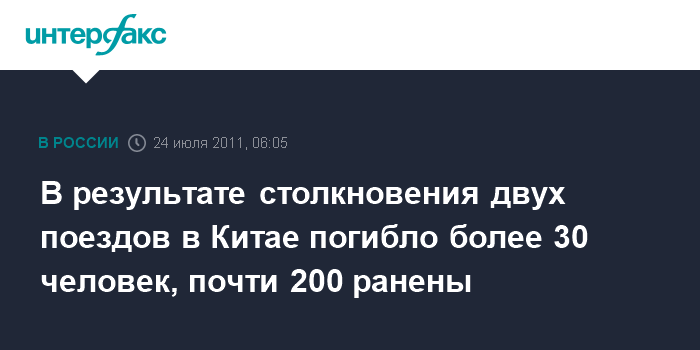 Пекин. 24 июля. ИНТЕРФАКС-КИТАЙ - В результате столкновения двух пассажирских поездов в восточной китайской провинции Чжэцзян погибли, по данным на утро воскресенья, 33 человека, 191 получил ранения.