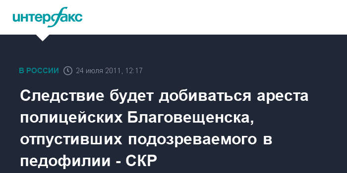 Москва. 24 июля. INTERFAX.RU - Следственный комитет России будет ходатайствовать об аресте благовещенских полицейских, отпустивших подозреваемого в педофилии, сообщил "Интерфаксу" в воскресенье официальный представитель СК РФ Владимир Маркин. "Несмотря на действия местной прокуратуры, следователи будут ходатайствовать об аресте сотрудников управления внутренних дел, отпустивших подозреваемого в педофилии", - подчеркнул В.Маркин.