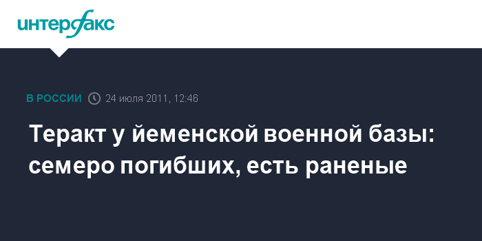 Лондон. 24 июля. INTERFAX.RU - По меньшей мере семеро военнослужащих убиты, еще несколько получили ранения в результате взрыва автомобиля в южном Йемене, передает в воскресенье британская телерадиовещательная корпорация Би-би-си. Взрывное устройство было приведено в действие у ворот армейской базы в Аденею Военные должны были выехать в близлежащую провинцию, чтобы принять участие в операции против боевиков-исламистов.