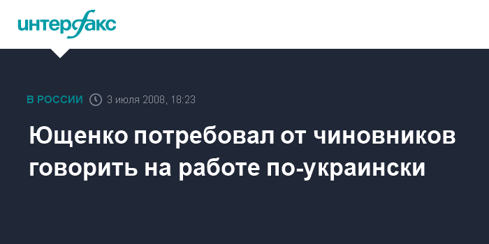 Москва. 3 июля. INTERFAX.RU - Президент Украины Виктор Ющенко требует, чтобы все государственные служащие соблюдали закон о государственном языке и говорили на украинском языке при исполнении своих обязанностей. "Как президент, я хотел бы обратиться ко всем государственным служащим: я требую, чтобы вы выполняли закон о государственном языке. Все остальные - это их право, право выбирать", - завил Ющенко в четверг в Киеве на всеукраинском форуме "Власть и бизнес - партнеры".
