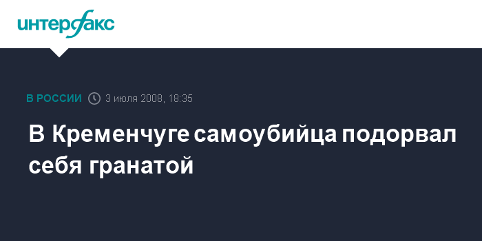 Москва. 3 июля. INTERFAX.RU - В Кременчуге Полтавской области 63-летний самоубийца подорвал себя при помощи гранаты, сообщили журналистам в среду в пресс-службе горуправления милиции.