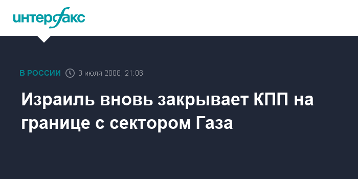 Иерусалим. 3 июля. ИНТЕРФАКС - Контрольно-пропускные пункты на границе сектора Газа и Израиля с пятницы вновь будут закрыты. Эта мера станет ответом на обстрел, предпринятый палестинскими радикалами в нарушение достигнутого между двумя сторонами перемирия. С таким заявлением выступила в четверг армия обороны Израиля.