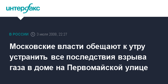 Москва. 3 июля. ИНТЕРФАКС - В префектуре Восточного административного округа Москвы сообщили, что последствия взрыва бытового газа в доме на Первомайской улице будут устранены к утру.