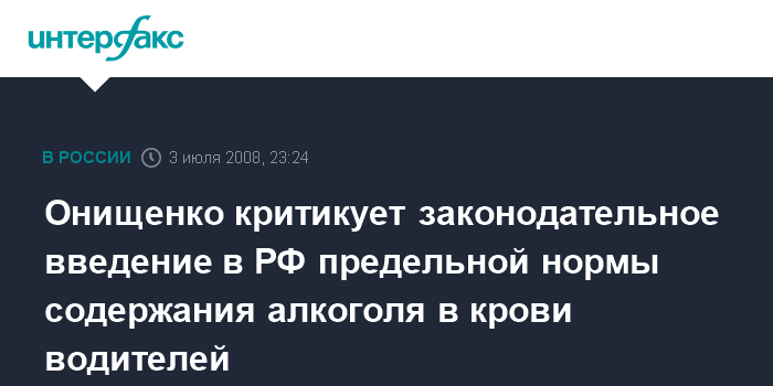 Москва. 3 июля. ИНТЕРФАКС - Главный государственный санитарный врач России, академик РАН Геннадий Онищенко считает вредной вступившую в силу 1 июля норму, устанавливающую предельное количество содержания алкоголя в крови водителя.