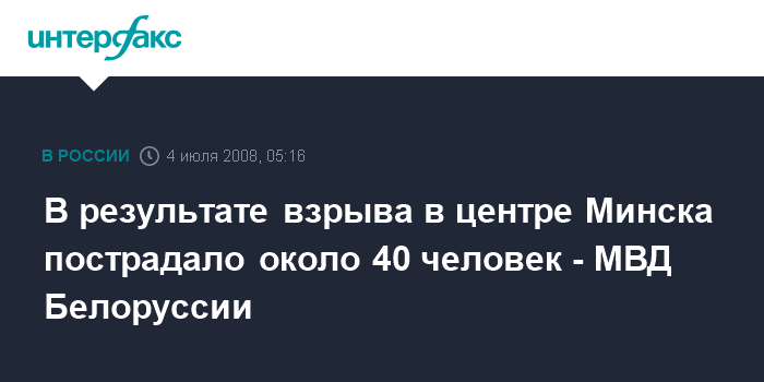 Минск. 4 июля. ИНТЕРФАКС - Около 40 человек ранено в результате взрыва в центре Минска, где проходили торжества по случаю дня независимости, сообщил "Интерфаксу" министр внутренних дел Белоруссии Владимир Наумов.