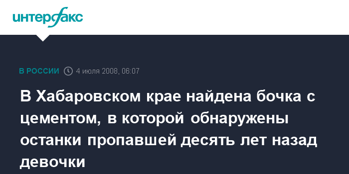 Хабаровск. 4 июля. ИНТЕРФАКС-ДАЛЬНИЙ ВОСТОК - В Хабаровском крае в куче бытового мусора возле карьера в районе автотрассы поселка Переяславка-Невельское найдена 200-литровая бочка, залитая раствором цемента, в которой обнаружены останки девочки 6-7 лет и фрагменты детской одежды.