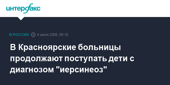 Москва. 4 июля. INTERFAX.RU - В больницах Красноярского края, по данным на пятницу, находятся 122 ребенка с диагнозом "иерсинеоз". Как сообщили агентству "Интерфакс-Сибирь" в пресс-службе Роспотребнадзора Красноярского края, за прошедшие двое суток было в больницы края поступили девять детей с иерсинеозом. Никто из ранее заболевших детей пока не выписан.
