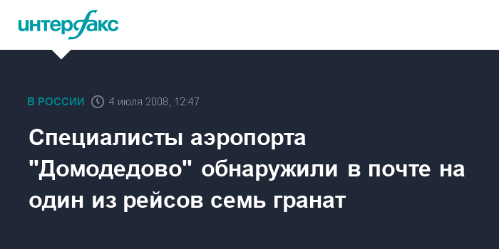 Москва. 4 июля. INTERFAX.RU - Инспекторы отдела досмотра груза и почты столичного аэропорта "Домодедово" 3 июля при досмотре почты в ходе регистрации на рейс Москва-Норильск обнаружили 7 гранат Ф-1 и запалов к ним, сообщила пресс-служба аэропорта.