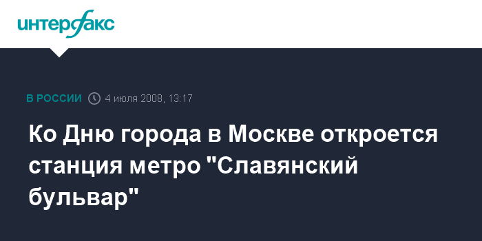 Москва. 4 июля. INTERFAX.RU - Через два месяца откроется станция "Славянский бульвар" Арбатско-Покровской линии Московского метрополитена, сообщил "Интерфаксу" руководитель пресс-службы метрополитена Александр Головин.