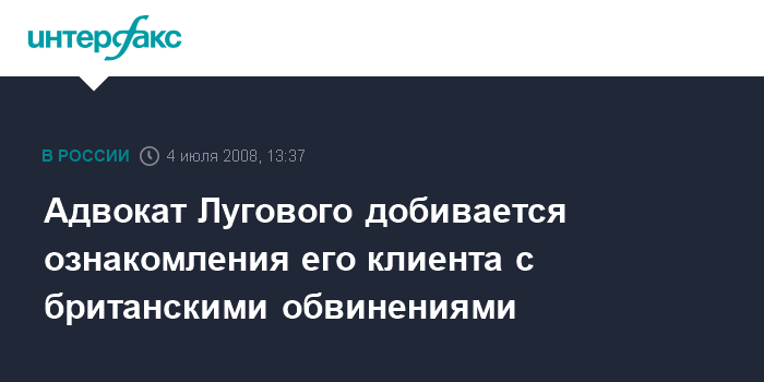Адвокат пояснил, что в качестве основания для отказа в ознакомлении с материалами была названа причина, что "мы не являемся стороной по делу, а Луговой является свидетелем". "Луговой не ознакомлен с содержанием обвинения выдвинутого против него Англией и, естественно, единственным выходом для нас является обращение в суд с тем, чтоб нам предоставили материалы", - отметил Ромашов, добавив, что защита будет обращаться в судебные органы.