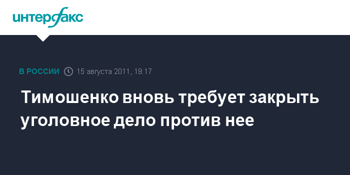Киев. 15 августа. INTERFAx.RU - Экс-премьер Украины, лидер партии "Батькивщина" Юлия Тимошенко требует не только изменить ей меру пресечения, но и закрыть уголовное дело против нее из-за отсутствия состава преступления.