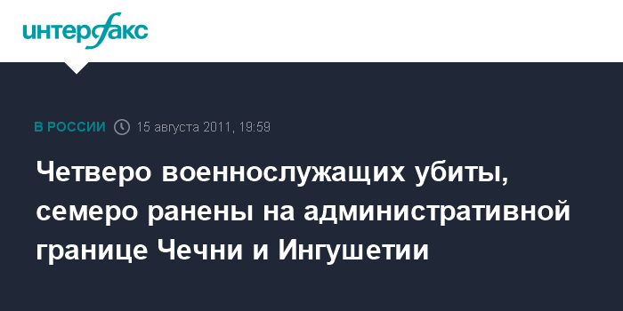 Назрань. 15 августа. INTERFAX.RU - В окрестностях селения Датых Сунженского района Ингушетии, в районе административной границы с Чеченской Республикой в результате обстрела колонны Внутренних войск Чечни четыре человека погибли, еще семеро получили ранения, сообщил агентству "Интерфакс-Юг" источник в правоохранительных органах Ингушетии.