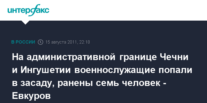 Ростов-на-Дону. 15 августа. ИНТЕРФАКС-ЮГ - Глава Ингушетии Юнус-Бек Евкуров сообщил, что в результате нападения на бойцов Внутренних войск на административной границе Чечни и Ингушетии пострадали семь человек.