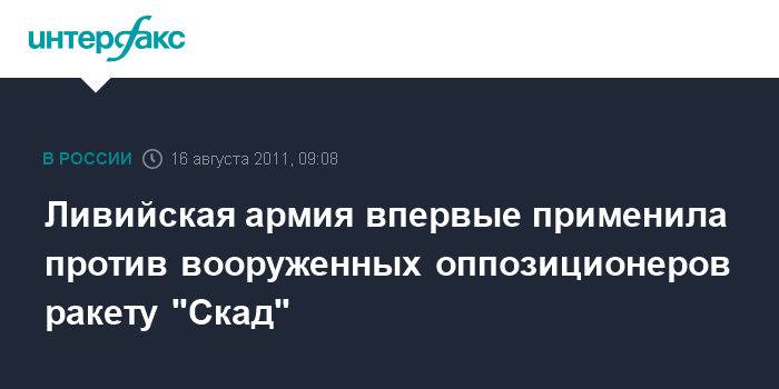 Вашингтон. 16 августа. INTERFAX.RU - Ливийская армия впервые после начала вооруженного сопротивления в стране применили против вооруженной оппозиции ракету Р-17 системы "Скад", констатируют представители оборонного сообщества США.