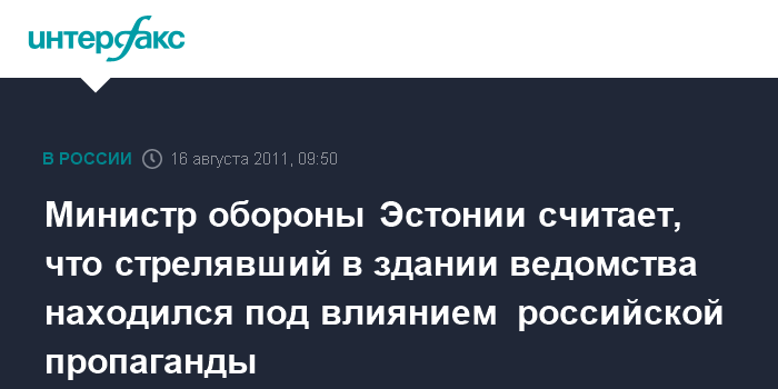 Таллин. 16 августа. INTERFAX.RU - Председатель партии Союз Отечества - Республика, министр обороны Эстонии Март Лаар считает, что открывший стрельбу в минувшую пятницу в здании военного ведомства в Таллине сделал это под влиянием российской пропаганды.