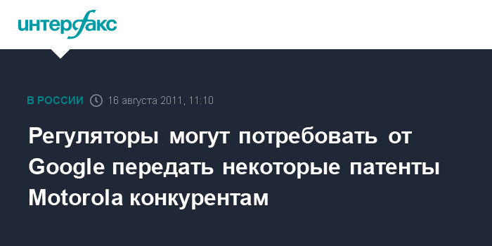 Вашингтон. 16 августа. INTERFAX.RU- Регуляторы США могут обусловить одобрение сделки по приобретению американского производителя Motorola Mobility Holdings Inc. интернет-гигантом Google Inc. за $12,5 млрд передачей некоторых патентов Motorola соперникам Google, чтобы гарантировать равные условия конкурентной борьбы на рынке смартфонов, сообщает агентство Bloomberg.