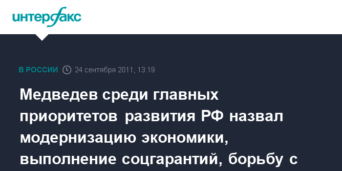 Медведев среди главных приоритетов развития РФ назвал модернизацию экономики, выполнение соцгарантий, борьбу с коррупцией