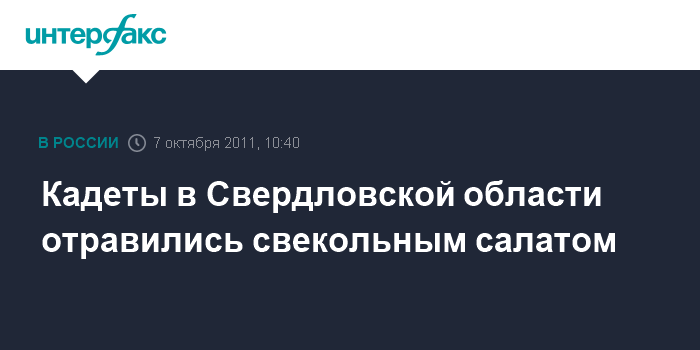 Москва. 7 октября. INTERFAX.RU - Салат из свеклы, по предварительным данным, стал причиной массового отравления кадетов профучилища "Юность" в Верхней Пышме в Свердловской области, сообщил "Интерфаксу" в пятницу руководитель Роспотребнадзора, главный государственный санитарный врач РФ Геннадий Онищенко.