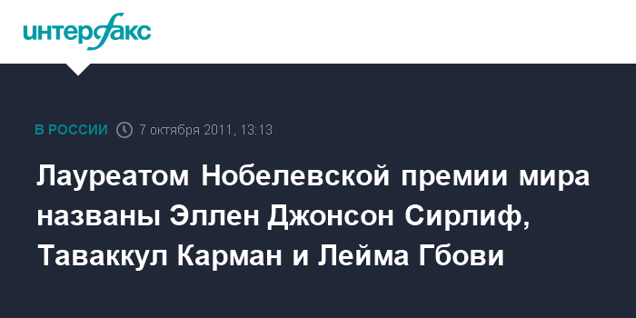Осло. 7 октября. INTERFAX.RU - Лауреатами Нобелевской премии мира 2011 года стали президент Либерии Эллен Джонсон Сирлиф, а также активисты Леймах Гбови и Таваккул Карман, объявили в пятницу в Нобелевском комитете в Осло.
