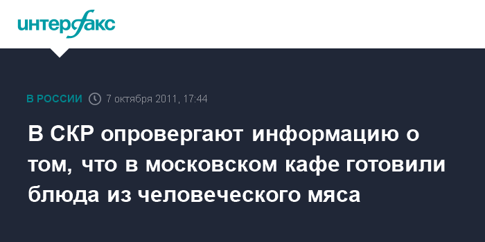 Москва. 7 октября. INTERFAX.RU - Распространенная некоторыми СМИ информация об использовании частей тела убитого человека для приготовления блюд в кафе в центре Москвы не соответствует действительности, заявил "Интерфаксу" в пятницу источник Главном следственном управлении СК РФ по Москве.