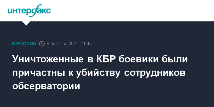 Москва. 8 октября. INTERFAX.RU - Национальный антитеррористический комитет (НАК) подтвердил данные о причастности уничтоженных в Кабардино-Балкарии двух боевиков к убийству сотрудников Эльбрусской обсерватории.