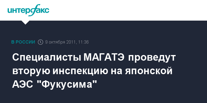 Лондон. 9 октября. INTERFAX.RU- Специалисты Международного агентства по атомной энергии (МАГАТЭ) прибыли в город Фукусима в Японии, чтобы оценить процесс ликвидации последствий аварии на атомной станции, сообщает BBC в воскресенье.