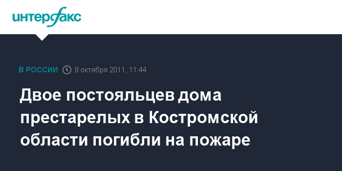 Москва. 9 октября. INTERFAX.RU - Число погибших при пожаре в доме престарелых в Костромской области возросло до двух человек, сообщил "Интерфаксу" источник в правоохранительных органах региона.