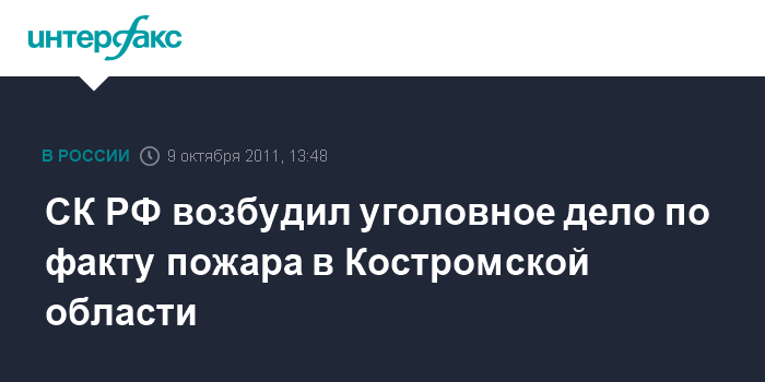 Москва. 9 октября. INTERFAX.RU - По факту пожара в доме престарелых в Костромской области СК РФ по региону возбудил уголовное дело по статье ч.3 ст.219 УК РФ - "нарушение требований пожарной безопасности, повлекшее по неосторожности смерть двух и более лиц".