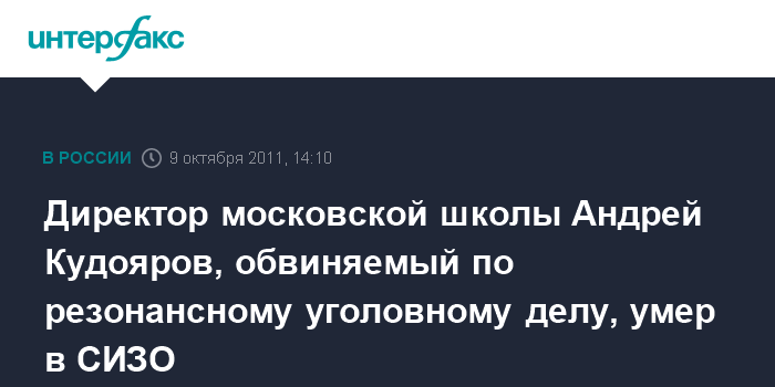 Москва.9 октября. INTERFAX.RU - Андрей Кудояров, директор школы номер 1308, арестованный в ноябре по обвинению в получении взятки, скончался в следственном изоляторе номер 3 в Силикатном проезде на северо-западе Москвы, сообщил "Интерфаксу" в воскресенье высокопоставленный источник в правоохранительных органах.