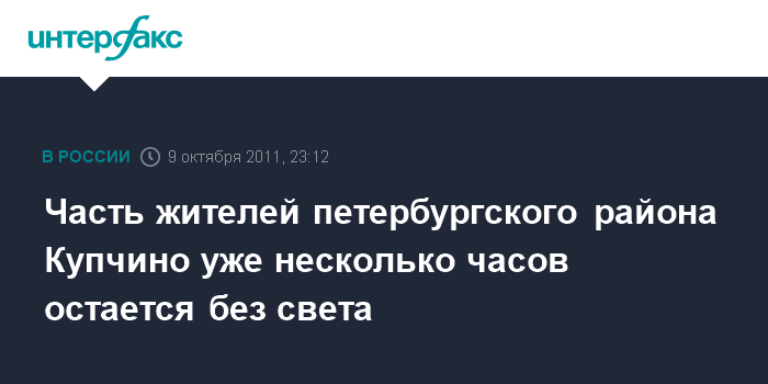 Москва. 9 октября. INTERFAX.RU – Жители района Купчино Санкт-Петербурга жалуются на то, что уже несколько часов они лишены подачи электричества, также в районе не работают фонари и светофоры.
