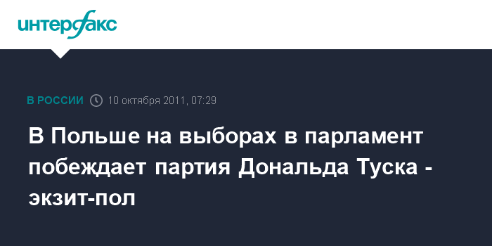 Лондон. 10 октября. ИНТЕРФАКС - В Польше согласно опросам на выходах из избирательных участков правящая партия "Гражданская платформа" премьер-министра Дональда Туска выигрывает выборы в парламент, набирая 39,6% голосов избирателей, сообщила британская телерадиовещательная корпорация Би-би-си в понедельник.
