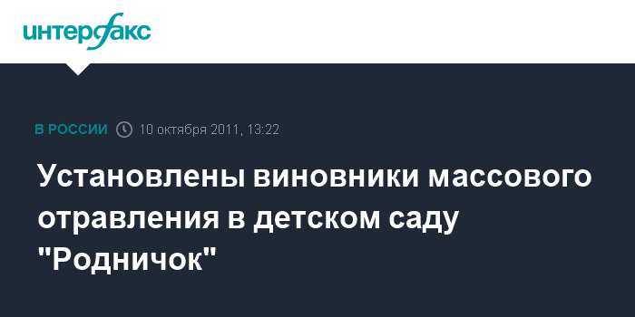 Екатеринбург. 10 октября. INTERFAX.RU - Межведомственная комиссия, созданная для выяснения причин вспышки кишечной инфекции в детском саду "Родничок" в Свердловской области, где заболело почти 80 детей, пришла к выводу, что виновными в происшествии являются заведующая дошкольным учреждением и сотрудники городского управления образования, сообщает департамент информационной политики губернатора региона.