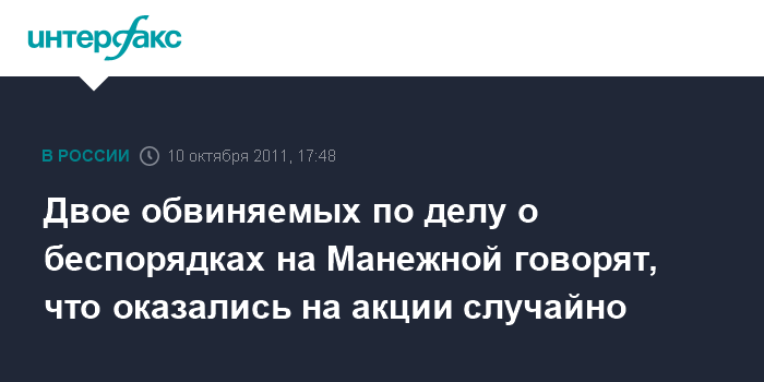 Москва. 10 октября. INTERFAX.RU - Двое фигурантов дела о беспорядках на Манежной площади в декабре прошлого года заявляют в суде, что не планировали участвовать в массовых акциях.