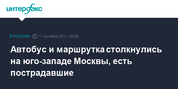 Москва. 11 октября. INTERFAX.RU - Два человека пострадали на юго-западе Москвы в результате столкновения рейсового автобуса и маршрутного такси, сообщил "Интерфаксу" источник в правоохранительных органах.