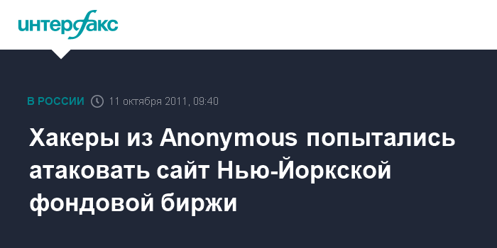 Москва. 11 октября. INTERFAX.RU – Работа сайта Нью-Йоркоской фондовой биржи была несколько затруднена после того, как представители хакерской группы Anonymous в рамках поддержки акции "захвати Уолл-Стрит" заявили о готовности организовать кибер-атаку на данный интернет-ресурс, сообщает во вторник The Wall Street Journal.